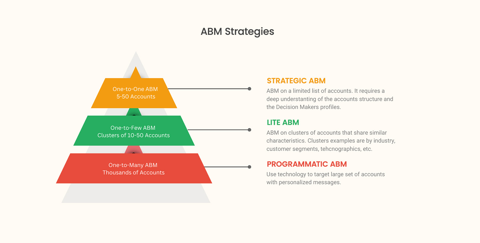 Also known as ABM Lite, this approach involves targeting small groups of accounts typically divided by sector, a common size or location, or similar pain points and needs.